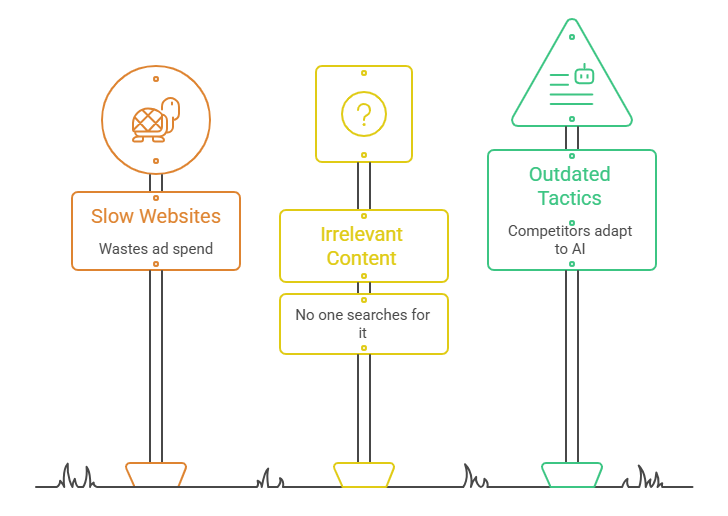 Here’s what usually goes wrong. Companies spend thousands on ads that send traffic to slow websites. They create content nobody searches for. They optimize for outdated tactics while competitors adapt to AI search engines and new platforms. The result is stagnant growth and confusion about where the real problem lies.