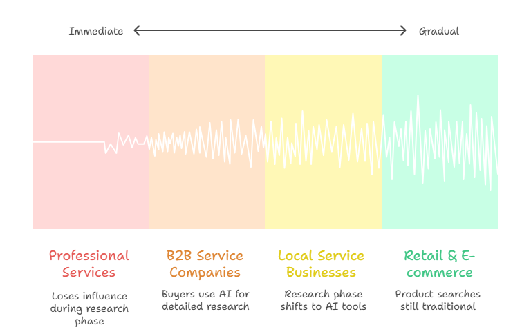 The impact varies significantly across industries and business models. B2B service companies face the most immediate disruption because their buyers use detailed research processes where AI tools excel. A business researching web development agency in Dubai options will likely consult AI tools for guidance on technology stacks, cost expectations, and vendor selection criteria before ever visiting individual agency websites.